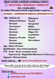 An Indian Pharmaceuticals Organisation Requires ASPIRING / EXPERIENCED MEDICAL REPRESENTATIVE
