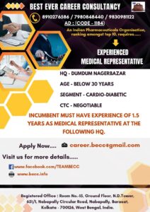 An Indian Pharmaceuticals Organisation, ranking amongst top 10, requires EXPERIENCED MEDICAL REPRESENTATIVE