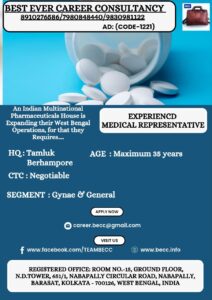 A Indian Pharmaceuticals House is Expanding their West Bengal Operations, for that they Requires EXPERIENCED MEDICAL REPRESENTATIVE