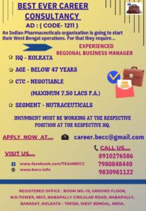 An Indian Pharmaceuticals organisation is going to start their West Bengal operations. For that they requires EXPERIENCED REGIONAL BUSINESS MANAGER