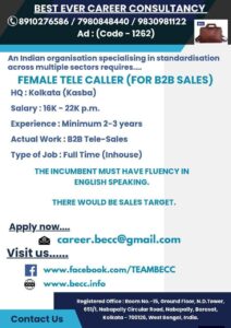 An Indian organisation specialising in standardisation across multiple sectors requires…. FEMALE TELE CALLER (FOR B2B SALES)